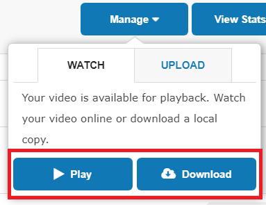 If you enabled Automatic Recording and/or the Extended VOD features for your event, the video will be available for you to watch or download after the event. Click Manage and then click Play or Download. You can access these features as long as the video-on-demand remains available (minimum 24 hours, but longer depending on your Extended VOD setting).