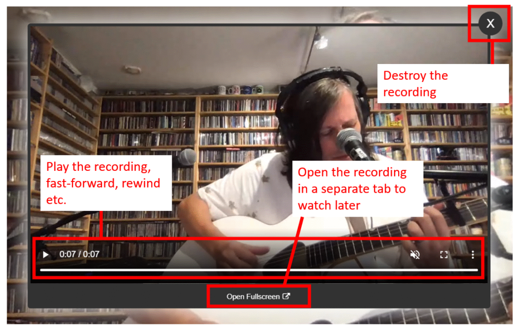 Recorded video will appear as a light-box on top of your publisher stage. You can watch the video right away and, when done, dismiss the video by click the X button. if you wish to preserve the video and watch later, click the Open Fullscreen button instead.