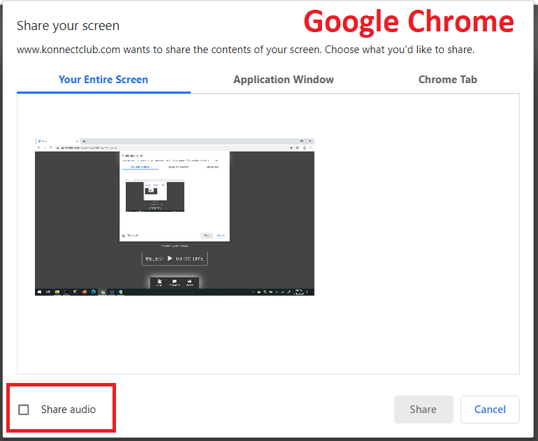 - You can select an additional option to include audio, if your browser supports sharing screen audio (currently supported only in Google Chrome on Windows and macOS).