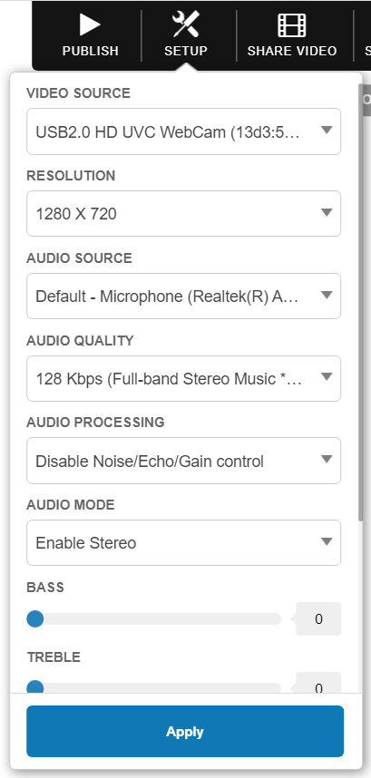 You can change your A/V settings by clicking the Setup button from the top panel. The setup will show you the following prompt. If you have an audio or video equipment connected to this computer, and if they are recognized as valid devices for your computer, then they will show up in the list.