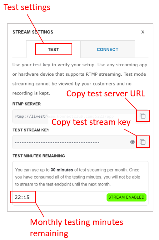 Once you enable RTMP streaming for an event, you can immediately start testing in the Test Mode. To access your stream settings click Test ➜ Present and make sure that you are on the TEST tab. Copy all the required info as highlighted below.