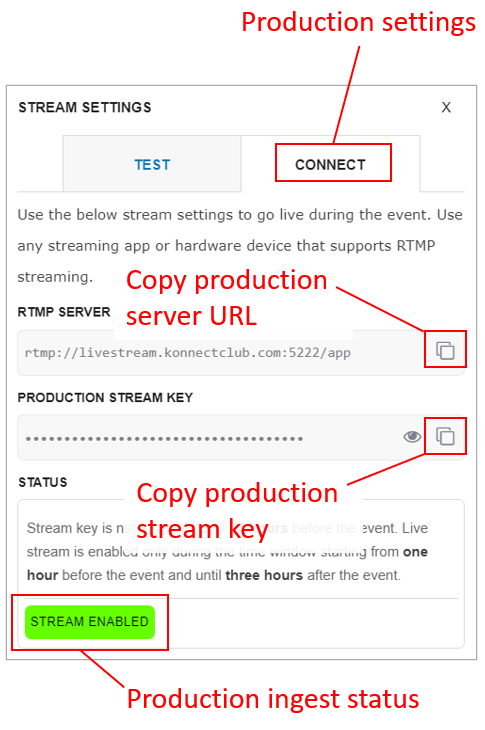To go live during the event, you must use the Production Stream Key provided to you. To access stream settings, click Connect ➜ Present and make sure that you are on the CONNECT tab. This stream key is generated 24 hours before the event, and it will only accept the RTMP feed starting from one hour before the event, up until three hours after the event.