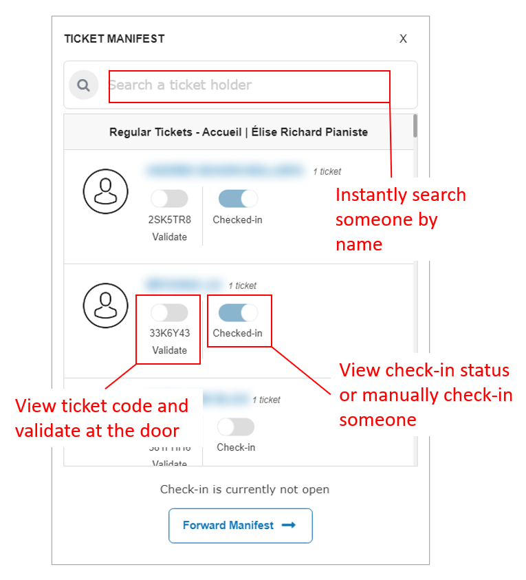 On the Ticket manifest screen, you can look up anyone by name using the instant search. We recommend using this at the door or check-in booth instead of using a download copy to make sure that you are not missing any last minute ticket buyer.